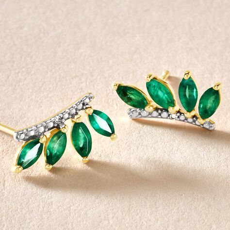 Boucles D'oreilles Puces Navette Or Jaune Emeraude Diamant