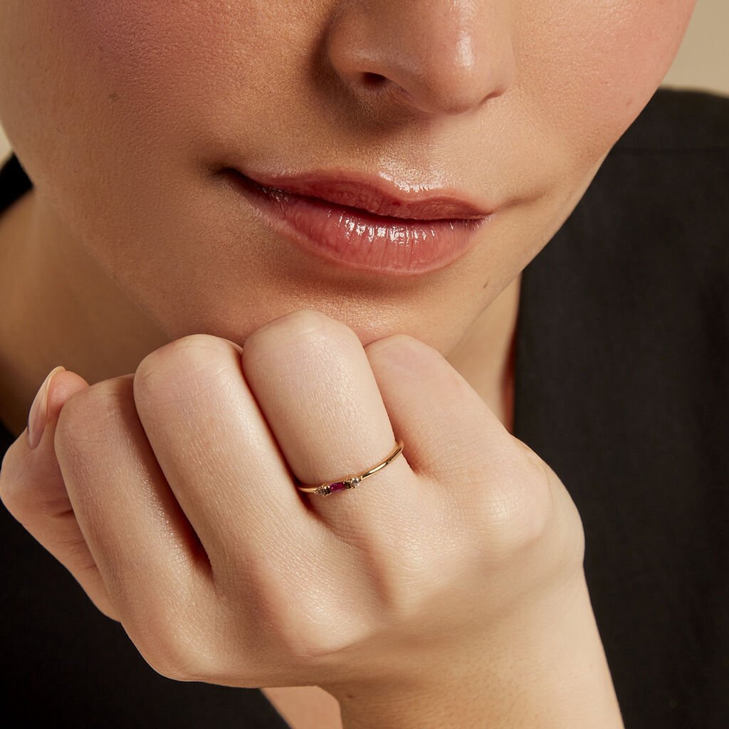 Bague Plaqué Or Jaune Pierre D'imitation Fuschia Forme Baguette Accompagné Oxydes De Zirconium