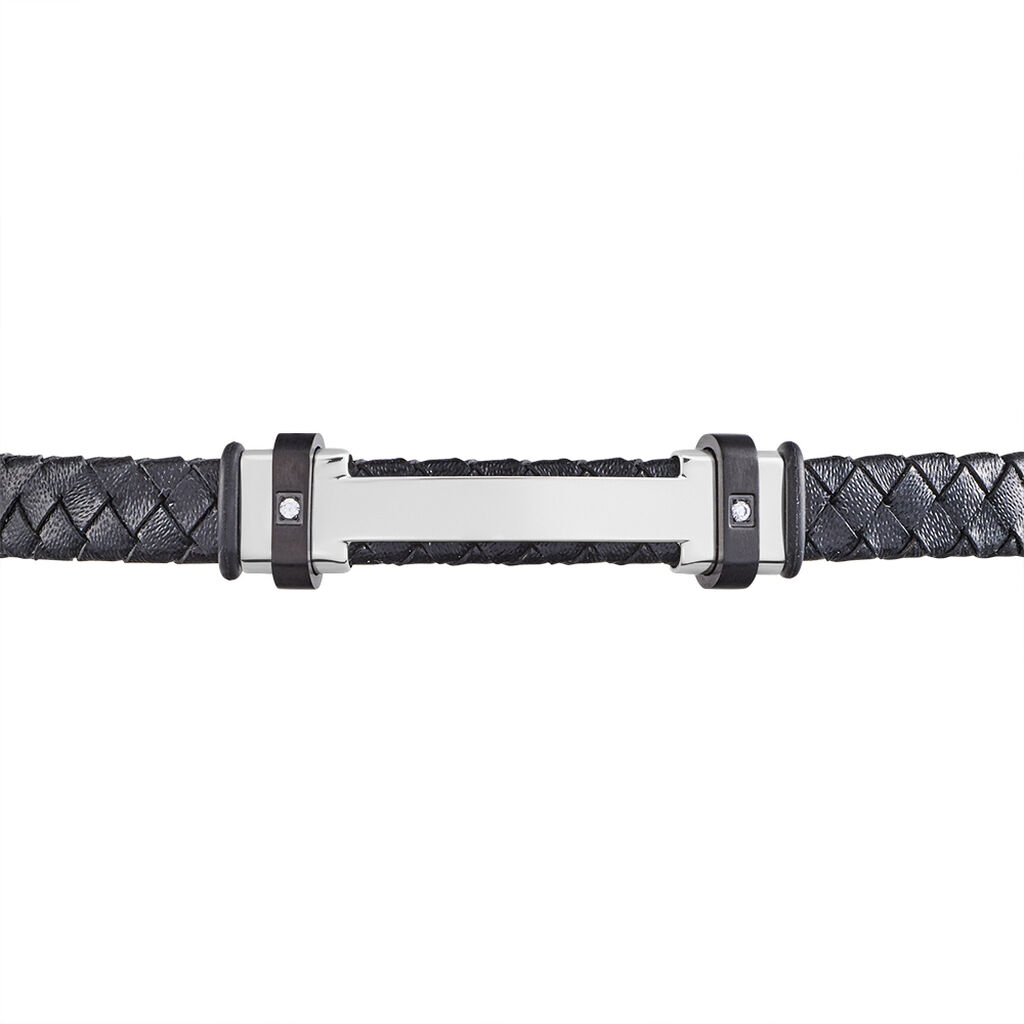 Bracelet Acier Inoxydable Blanc Plaque Acier Et Carbone Noir Oxydes De Zirconium Cuir De Vache Noir Tressé 21cm