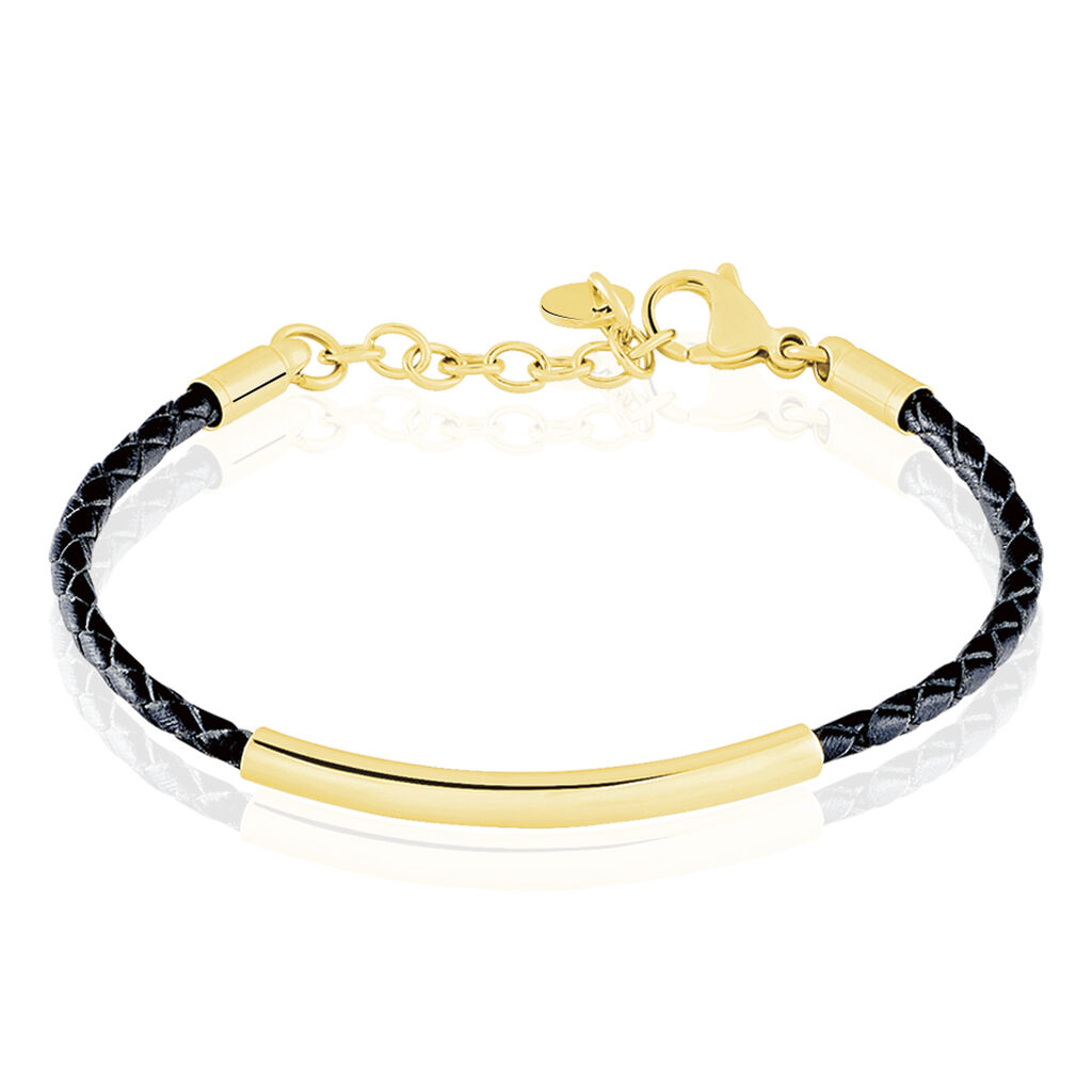 Bracelet Acier Dore Et Cuir Noir Fin Barrette 21cm