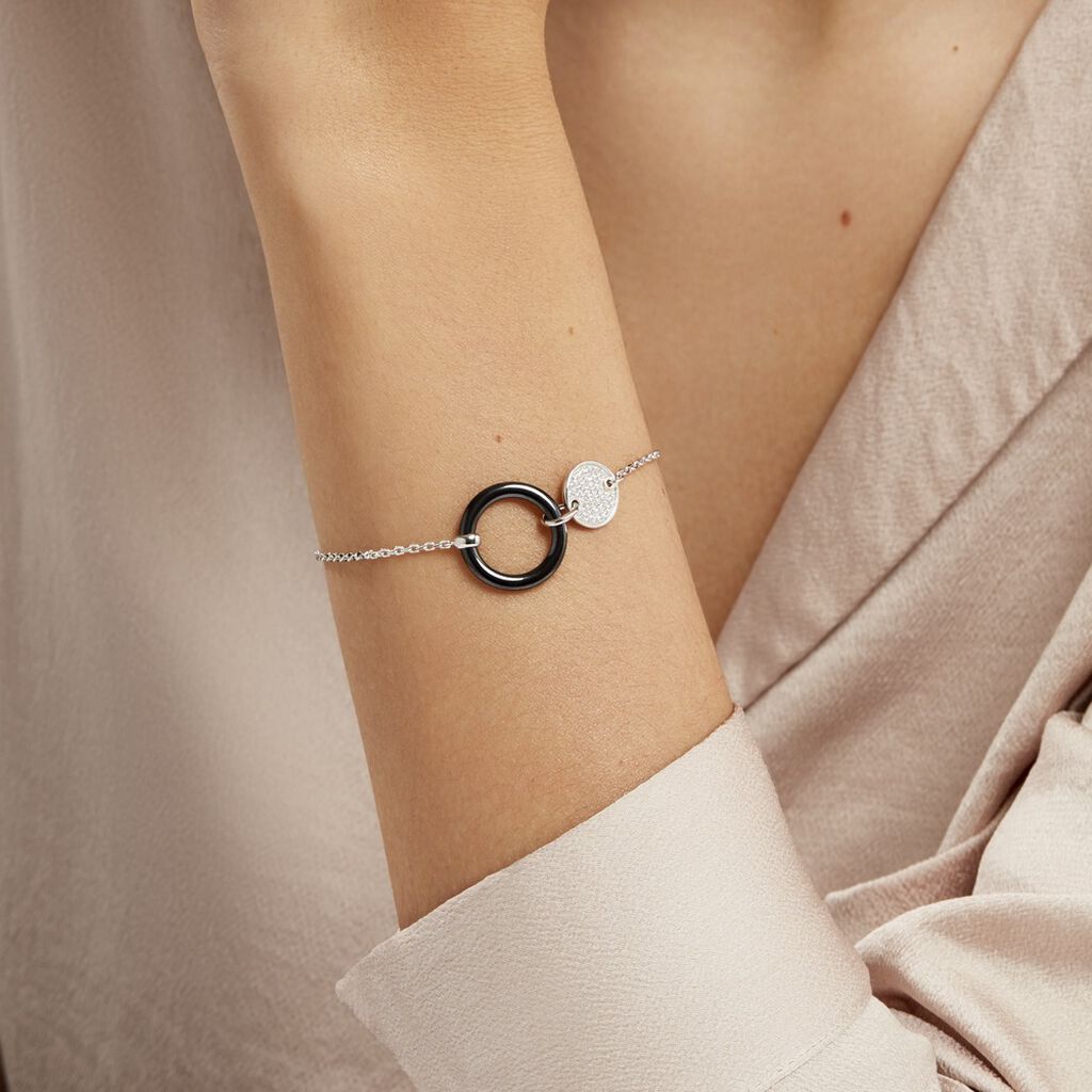 Bracelet Argent Blanc 925/1000 Ceramique Noire Et Oxyde De Zirconium Forme Rond 16cm