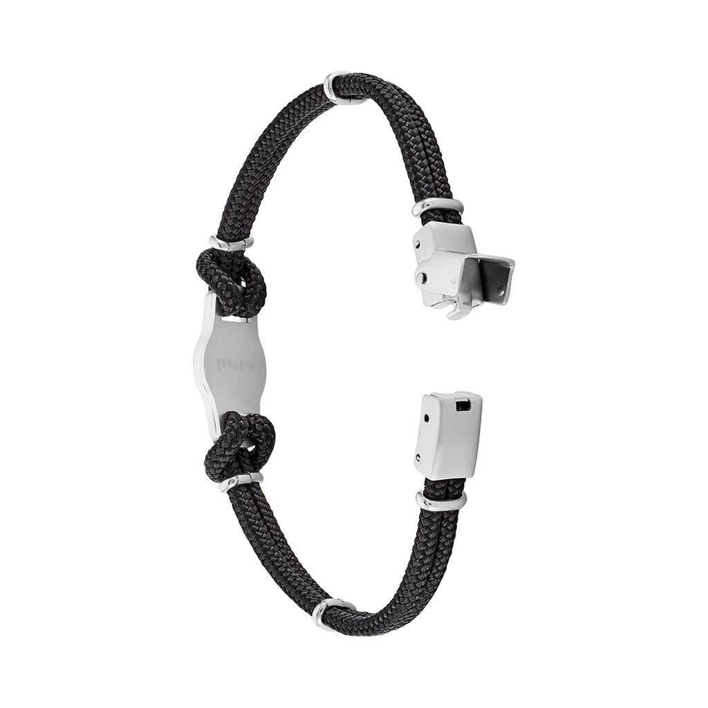 Bracelet Acier Inoxydable Blanc Cordon Noir Pastille Centrale Motif Gourvernail 21cm