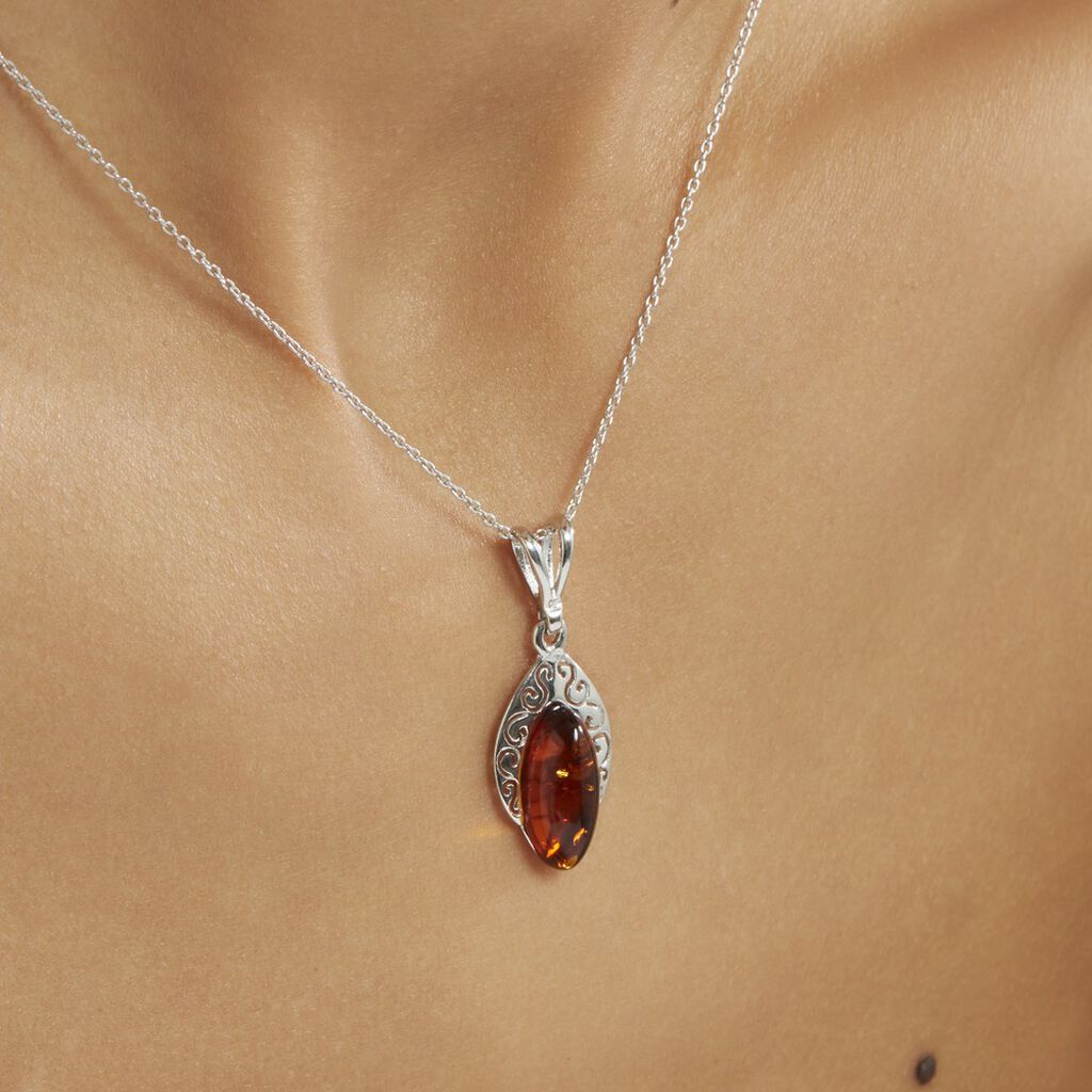 Collier Argent Blanc 925/1000 Ambre Cognac Motifs Ethniques 42cm