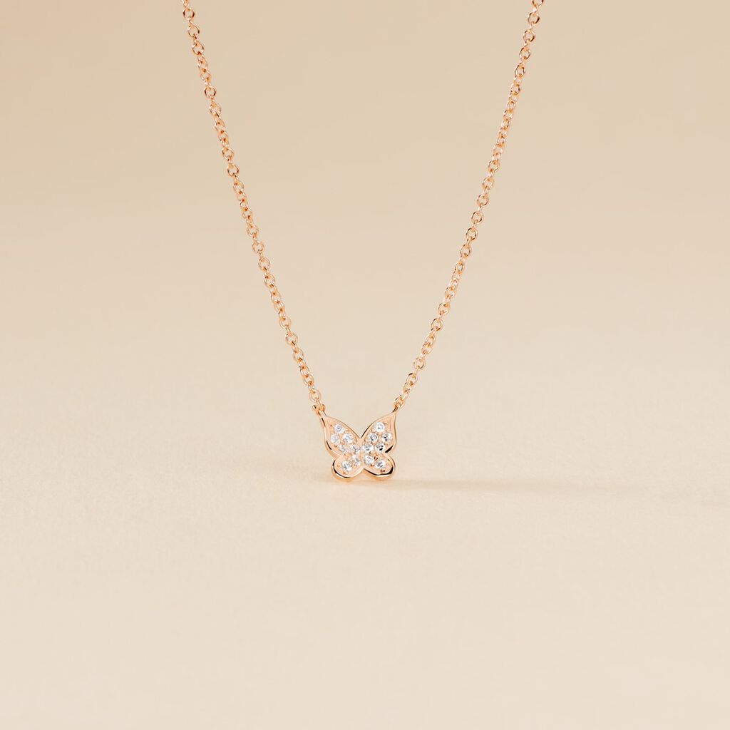 Collier Court Argent Rose 925/1000 Papillon Oxyde De Zirconium Maille Forcat Serti Griffes 38cm