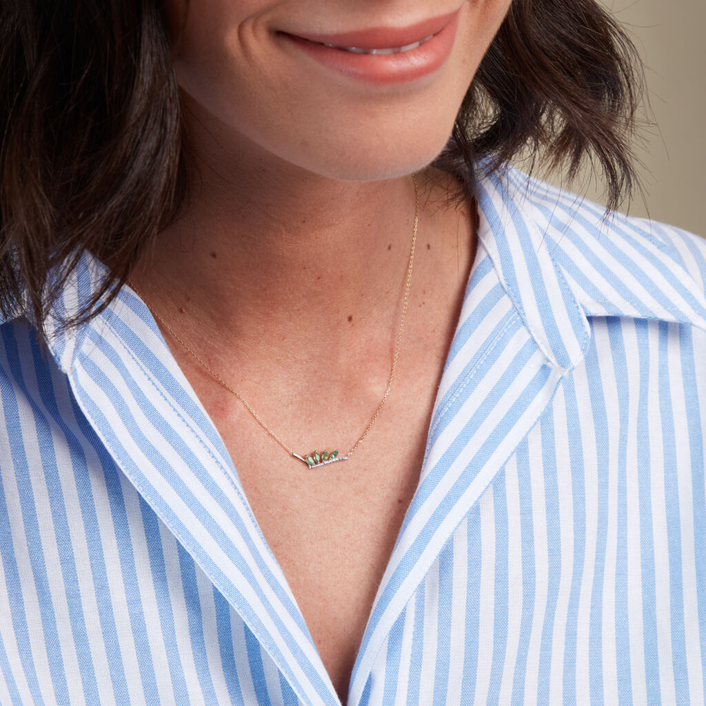 Collier Or Jaune 375/1000 Petales Emeraude Navette 0.28 Cts Serti Griffes Et Pavage Diamants 0.0030 Cts Maille Forcat 40+2cm