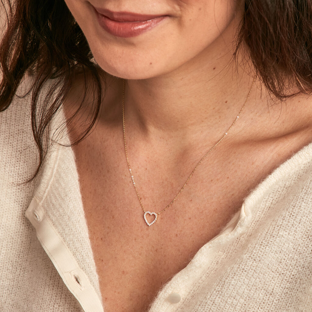 Collier Or Jaune 375/1000 Cœur Ajouré Oxyde De Zirconium Blanc Serti Griffes Maille Forçat 45cm