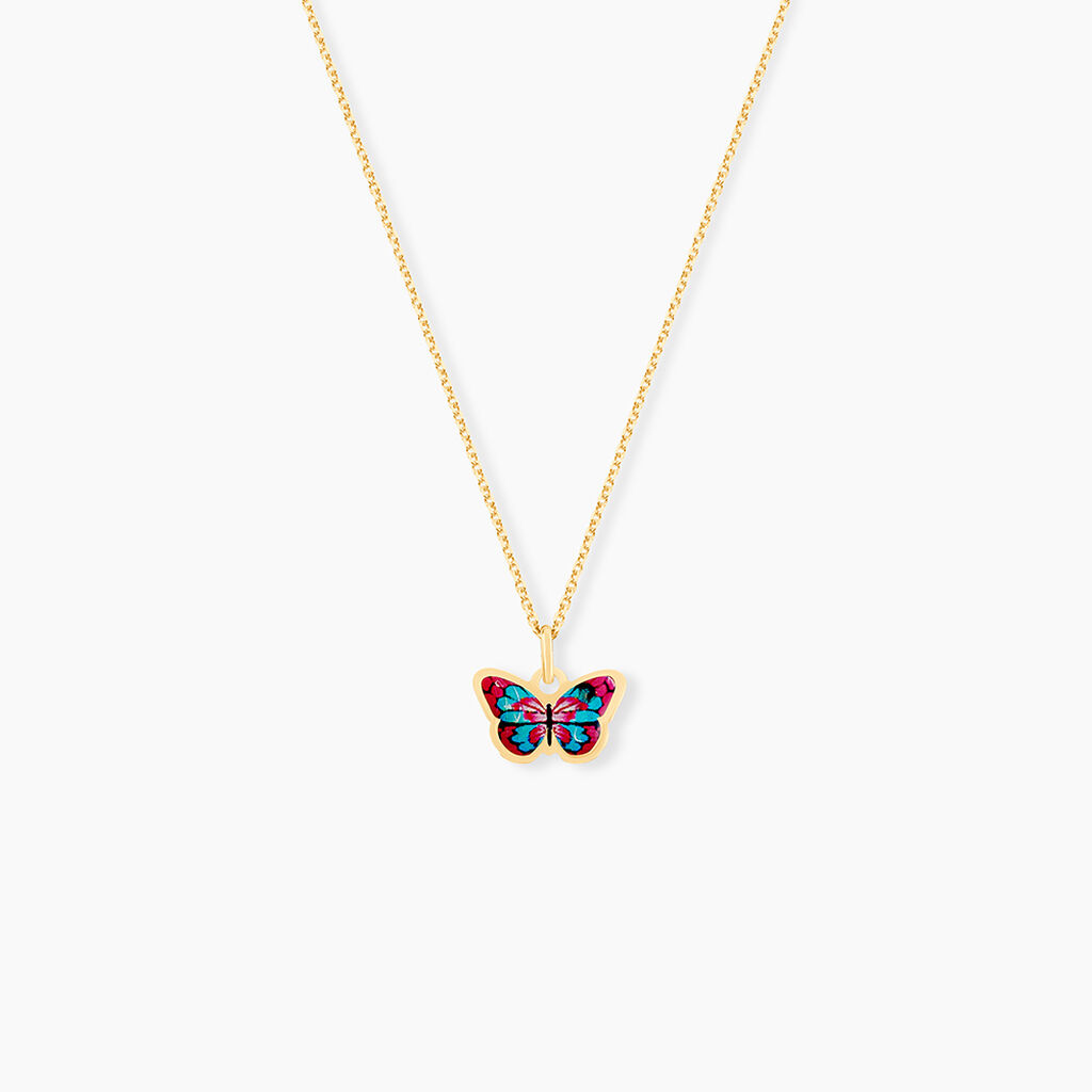 Collier Or Jaune 375/1000 Papillon Fushia Et Bleu Maille Jaseron 38cm