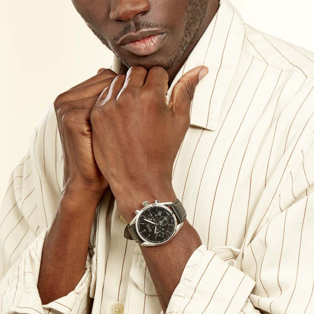 Montre Boss Champion Acier Blanc Ronde Quartz Chronographe 44mm Fond Noir Bracelet Cuir De Veau Noir 1513816