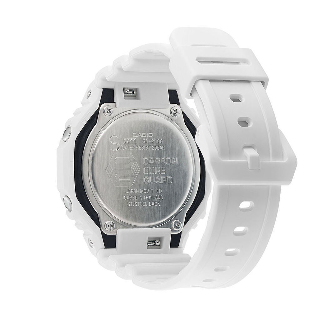 Montre Casio G-shock Classic Carbone Blanc Ronde Quartz 48.5mm Fond Noir Bracelet Résine Blanc 2atm Ga-2100-7aer