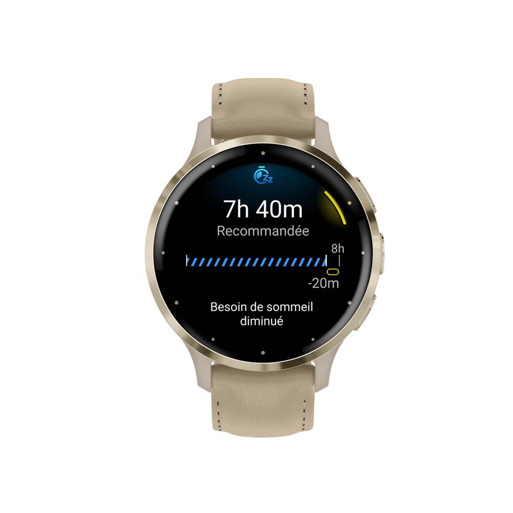 Montre Garmin Venu 3 Polymere Renforce De Fibres Beige Ronde Connectee Multifonctions 41mm Lunette Acier Dore Fond Noir Bracelet Cuir Beige 010-02785-55