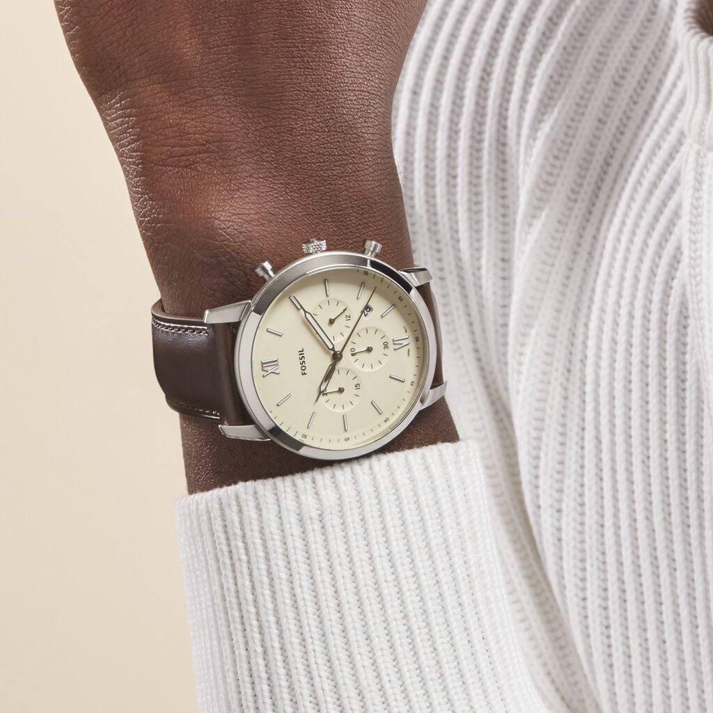 Montre Fossil Neutra Chrono Acier Blanc Ronde Quartz Chronographe 44mm Fond Beige Bracelet Cuir Brun Fs5380