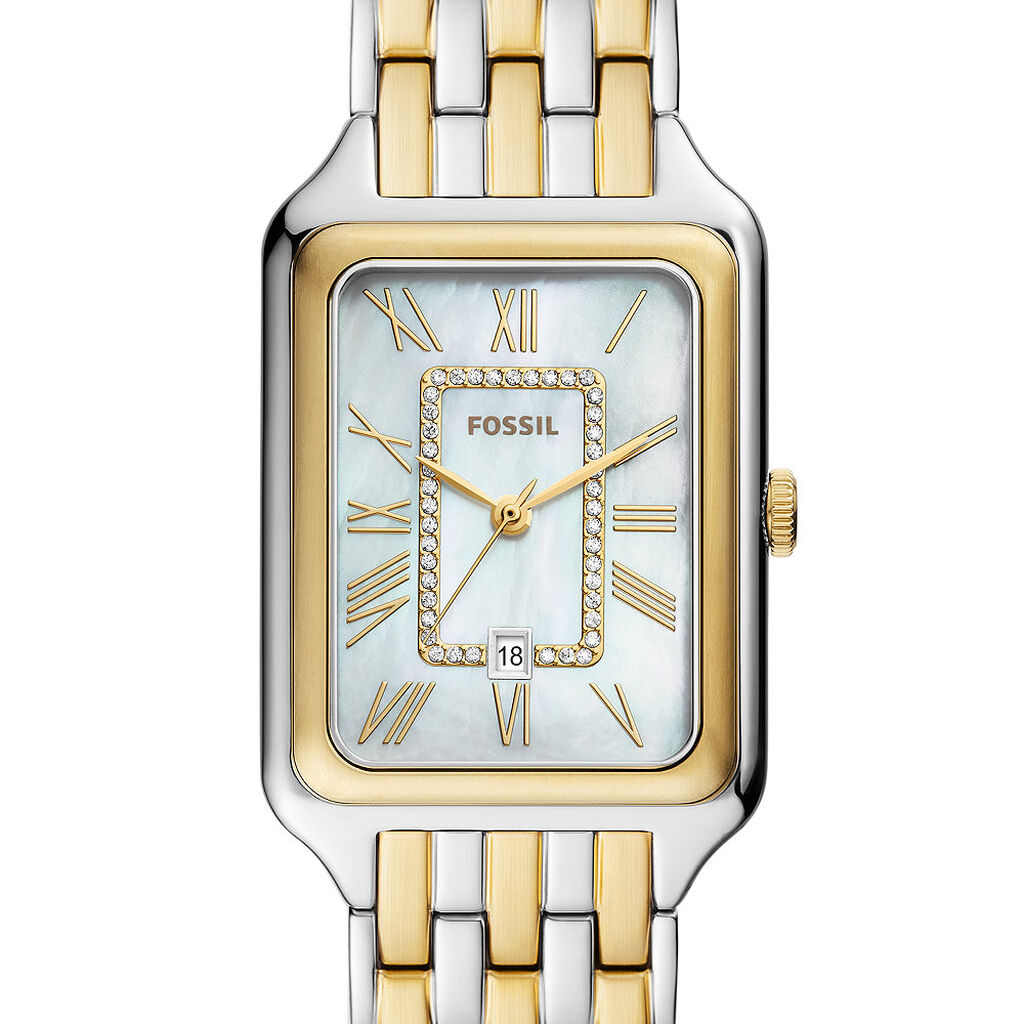 Montre Fossil Raquel Acier Bicolore Rectangulaire Quartz 26mm Fond Blanc Bracelet Acier Bicolore Es5305