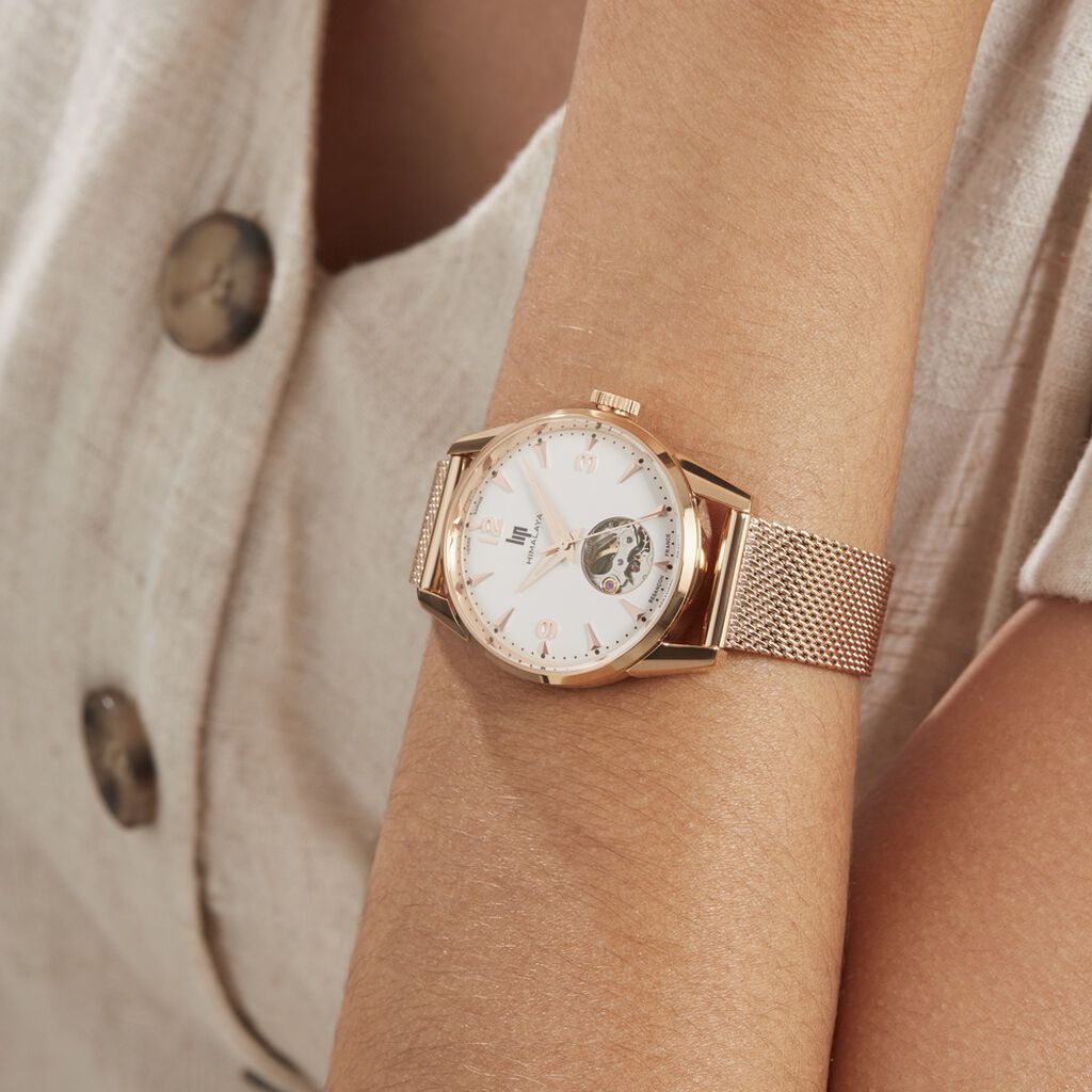 Montre Lip Himalaya Cœur Battant Acier Doré Rose Ronde Automatique 33.5mm Fond Weiss Bracelet Acier Doré Rose Maille Milanaise 671686