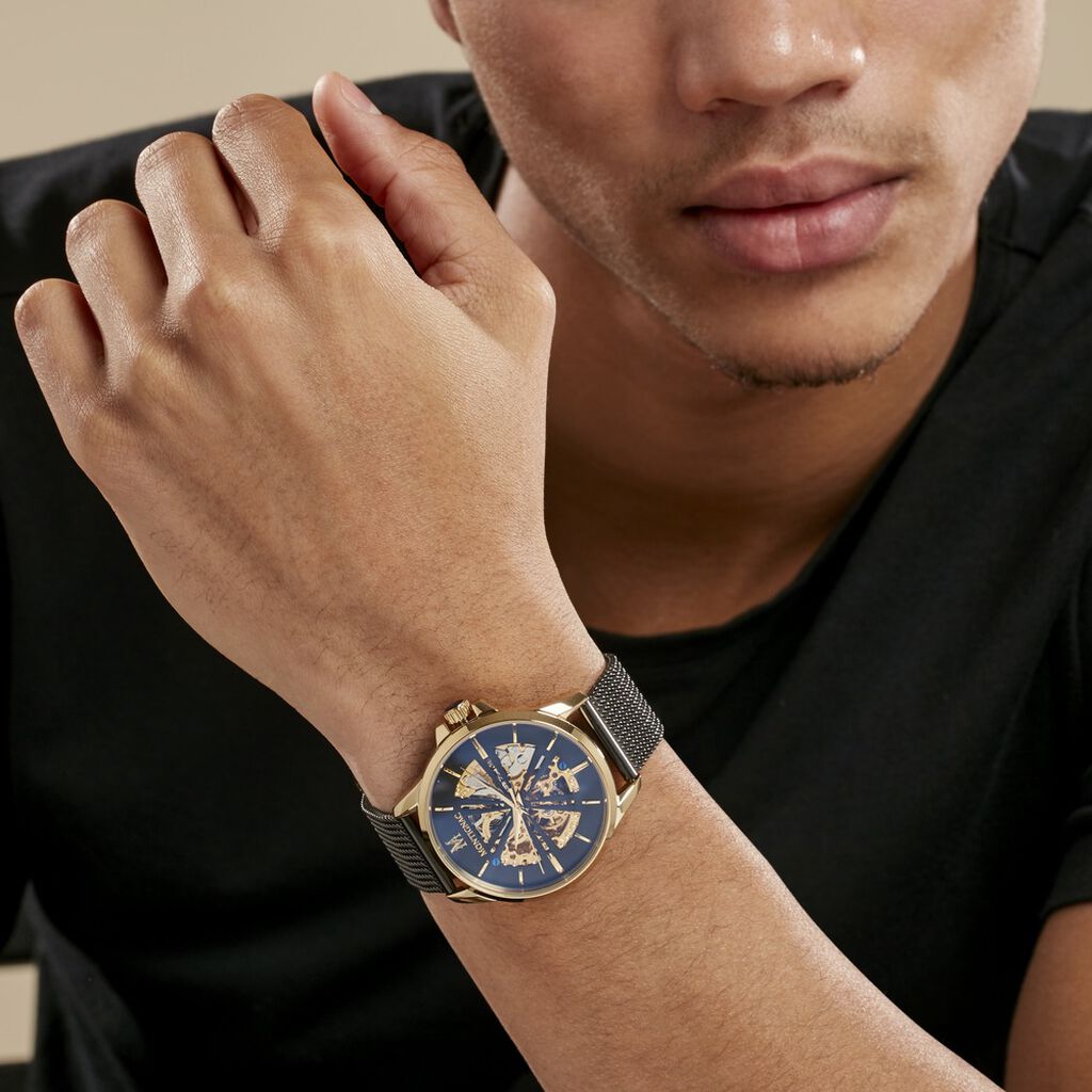 Montre Montignac Round Automatique Acier Doré Ronde Automatique 42mm Fond Noir Bracelet Acier Milanais Noir Mow404