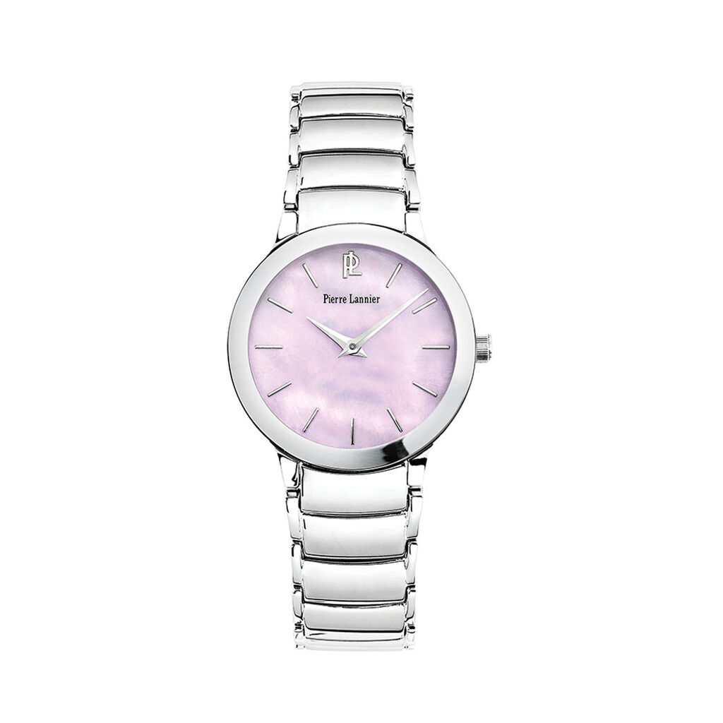 Montre Pierre Lannier Noelle Acier Blanc Ronde Quartz 28mm Fond Nacre Violet Bracelet Acier Blanc 018m698