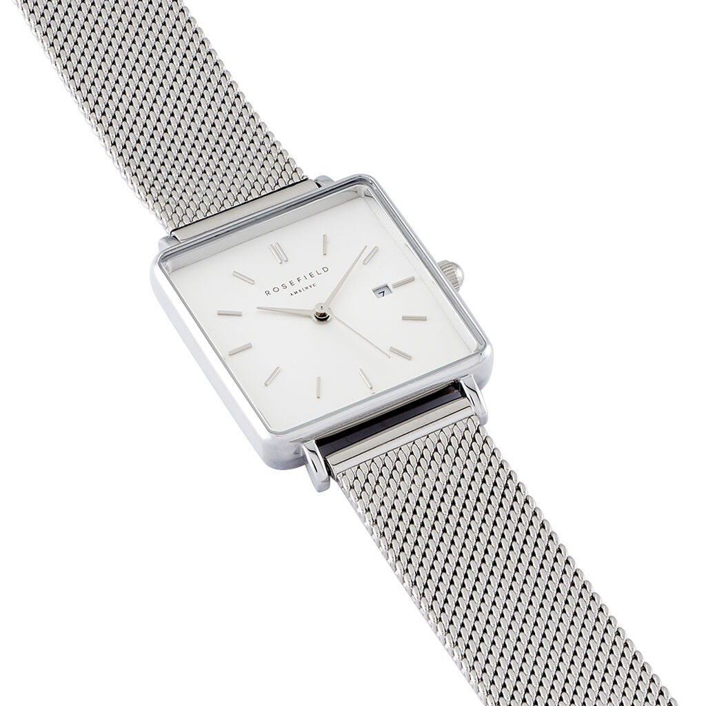 Montre Rosefield Boxy Acier Argenté Carré Quartz 26x28mm Fond Blanc Bracelet Milanais Acier Argenté Qwss-q02