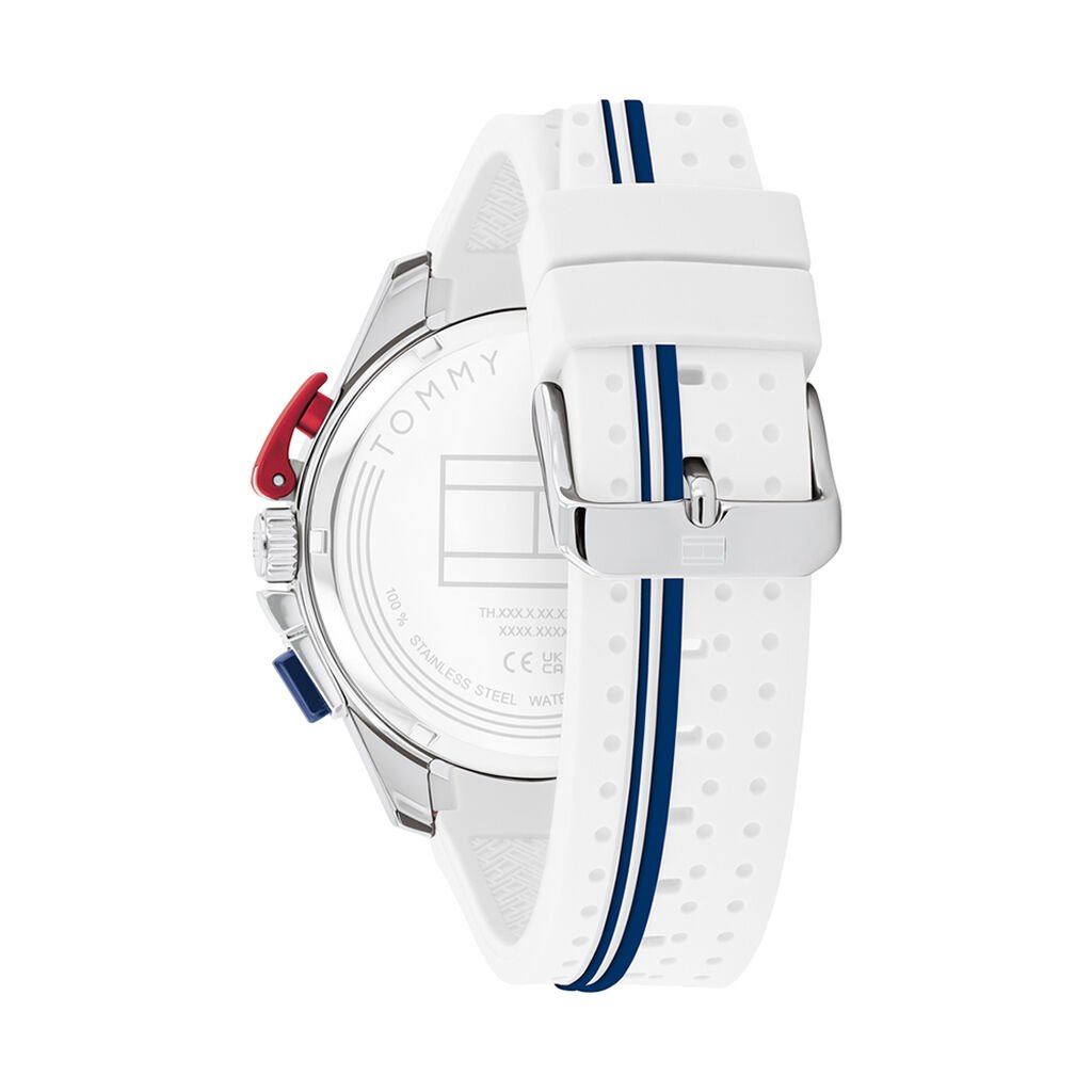 Montre Tommy Hilfiger Bank Acier Argente Ronde Quartz Chrono 46mm Fond Blanc Lunette Bleue Bracelet Silicone Blanc Rayure Bleu 1792167