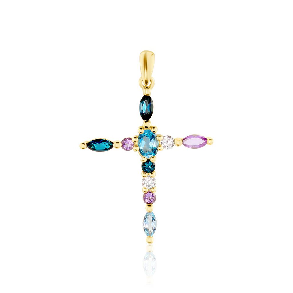 Pendentif Or Jaune 375/1000 Croix Topaze Amethyste Et Oxyde De Zirconium Serti Griffes