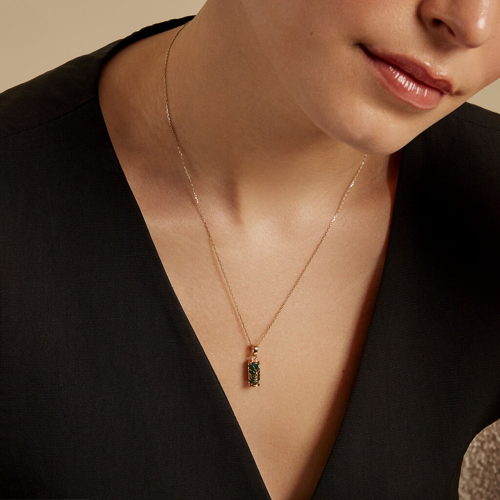 Pendentif Plaqué Or Jaune Forme Tube Agate Verte Motifs Ethniques